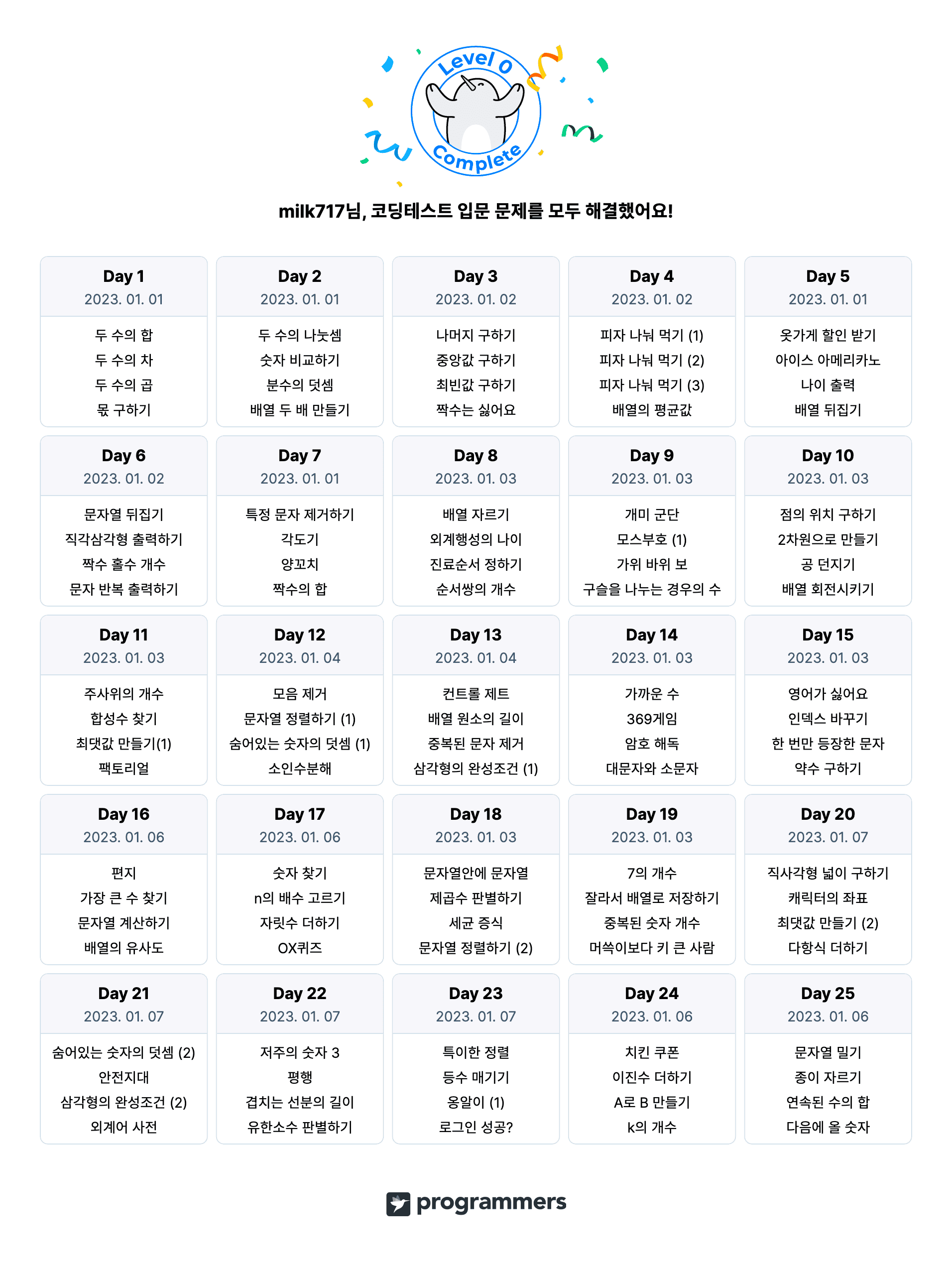 코딩테스트 언어도 JS로 바꾸는 김에 기초부터 다시 탄탄하게 학습하고자 프로그래머스의 코딩테스트 입문 100제를 풀었습니다. 30일 동안 하루에 4문제씩 풀게 되어있는 과정이지만, 잔뜩 동기부여가 되어있던 저는 일주일 만에 모두 풀 수 있었습니다.
