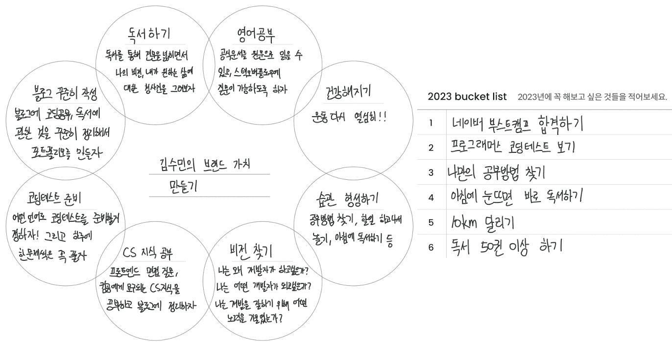 2023년을 회고하기 위해 새해에 작성했던 다이어리를 다시 펼쳐보게 되었는데요. 새해에 희망차게 계획했던 것이라 다소 거창한 목표들이 있지만 이 중 가장 핵심인 목표는 네이버 부스트캠프에 합격해서 활동하는 것이었습니다. 다른 개발 대외활동도 많지만 저는 꼭 부스트캠프에서 활동하고 싶었습니다. 2022년 초반에 함께 안드로이드 프로젝트를 했던 선배가 부스트캠프에서 활동하며 성장하는 모습을 보며 부스트캠프에 관심을 두게 되었고, 추가로 더 찾아보니 수료생들의 후기와 커리큘럼이 굉장히 마음에 쏙 들었습니다. 프론트엔드 개발자가 되고 싶었지만, 백엔드도 학습하고 싶었던 저에겐 풀스택 과정이라는 것이 엄청난 흥미를 불러일으켰죠. 제가 학교에서 본 멋진 선배들은 모두 분야를 가리지 않고 다양한 기술들을 익혀 사용할 수 있었고 저 또한 그런 능력을 갖춘 개발자로 성장하고 싶었습니다.