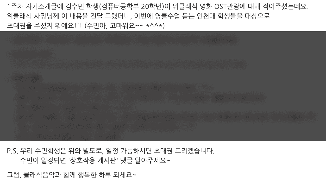 이런 제 진심을 하늘도 알아준 것인지 아주 우연한 기회를 통해 오케스트라 공연의 초대장도 받을 수 있었는데요. 강의 초반에 게시판에 자기소개를 올리는 것이 과제가 있었습니다. 이때 제가 적었던 자기소개에서 위클래식의 공연을 언급했습니다.