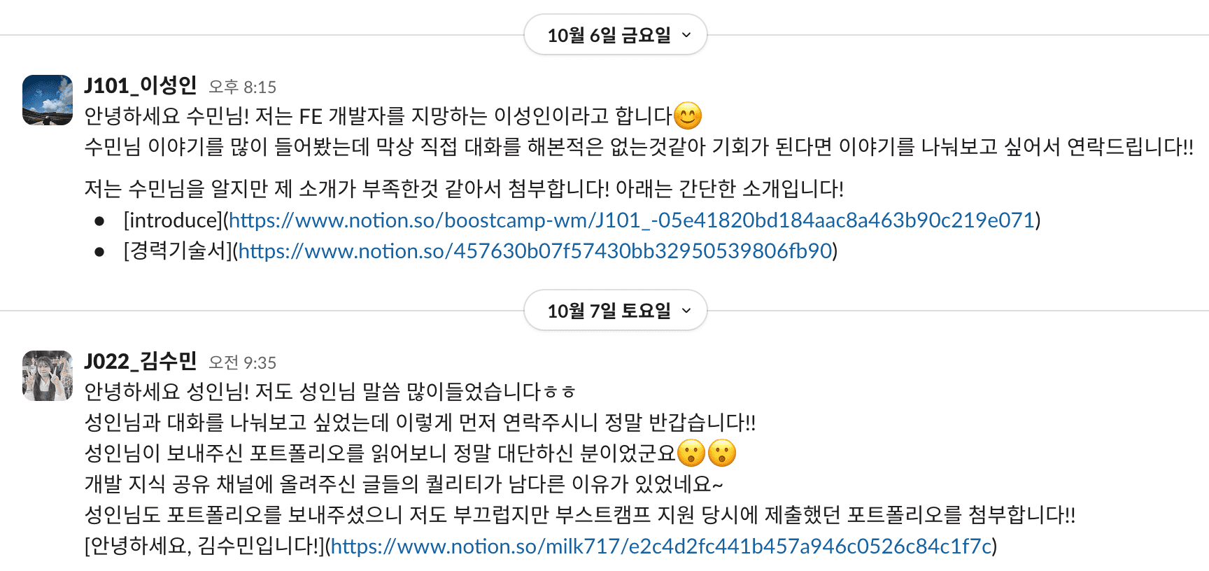우리 팀 NDD가 만나게 된 스토리부터 정말 독특한데요. 멤버쉽 과정을 진행하던 도중 성인님께 슬렉 DM이 왔습니다. 챌린지, 멤버쉽 과정을 통틀어서 한 번도 마주친 적이 없었지만, 워낙 활발하게 활동하셔서 이미 성인님을 알고 있었던지라 연락을 받았을 때 얼마나 반가웠는지 몰라요~