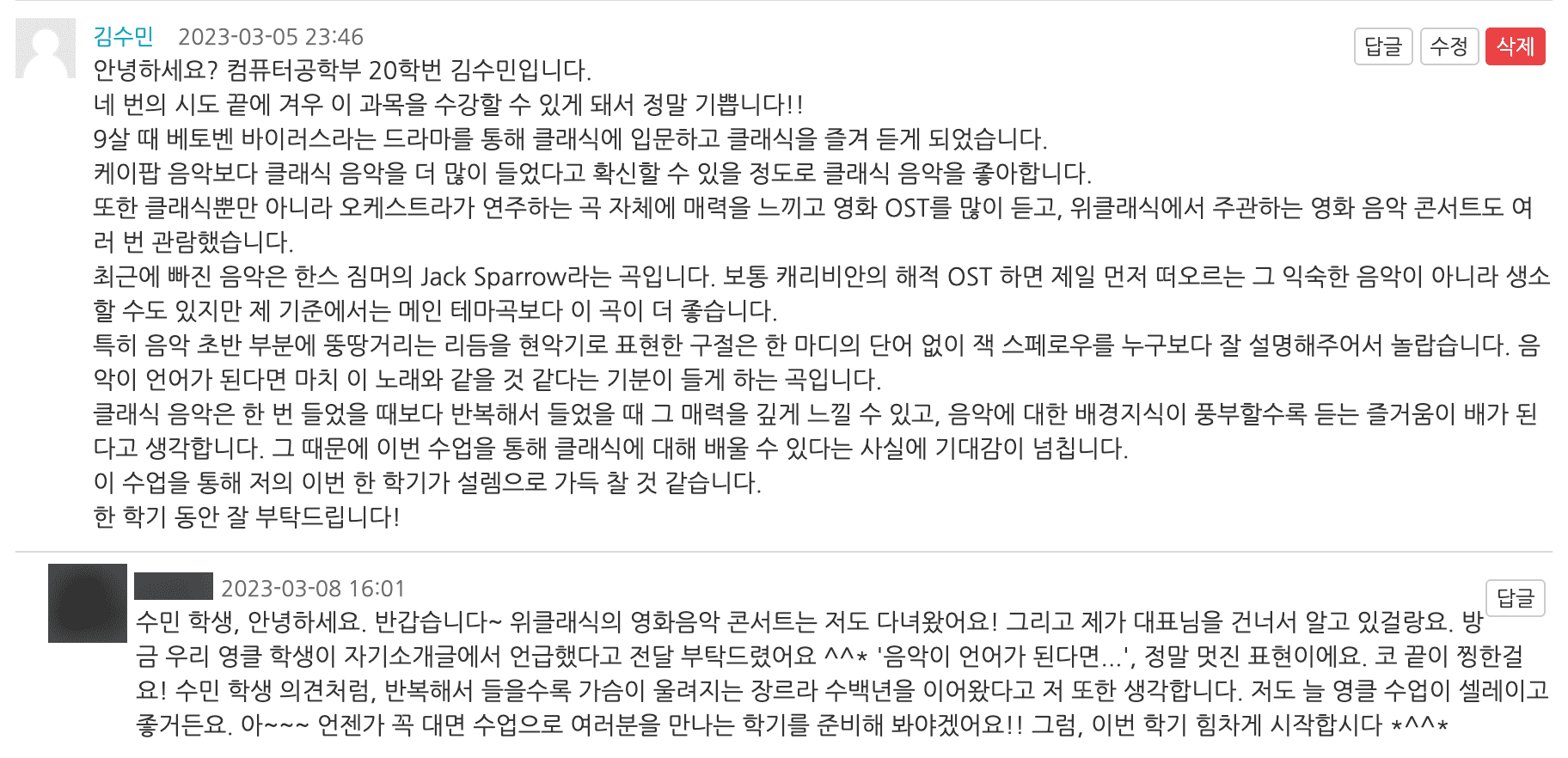저는 클래식 음악이 너무 좋아서 예전부터 이 강의를 꼭 듣고 싶었습니다. 하지만 수강 신청이 매우 힘들어서 몇 번이나 놓치곤 했는데요. 이번 학기에 드디어 수강할 수 있게 되었습니다.