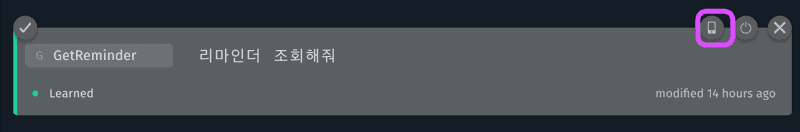 아까 빅스비를 학습시켰던 Training 페이지에 들어가서 학습시킨 발화 리스트 위에 마우스를 호버해보면 아래와 같이 휴대폰 아이콘이 뜬다.