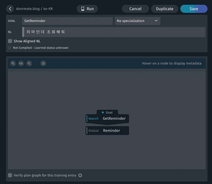 }위 코드를 설명하자면 GetReminder라는 액션을 만들고 액션의 타입을 Search로 지정한다.