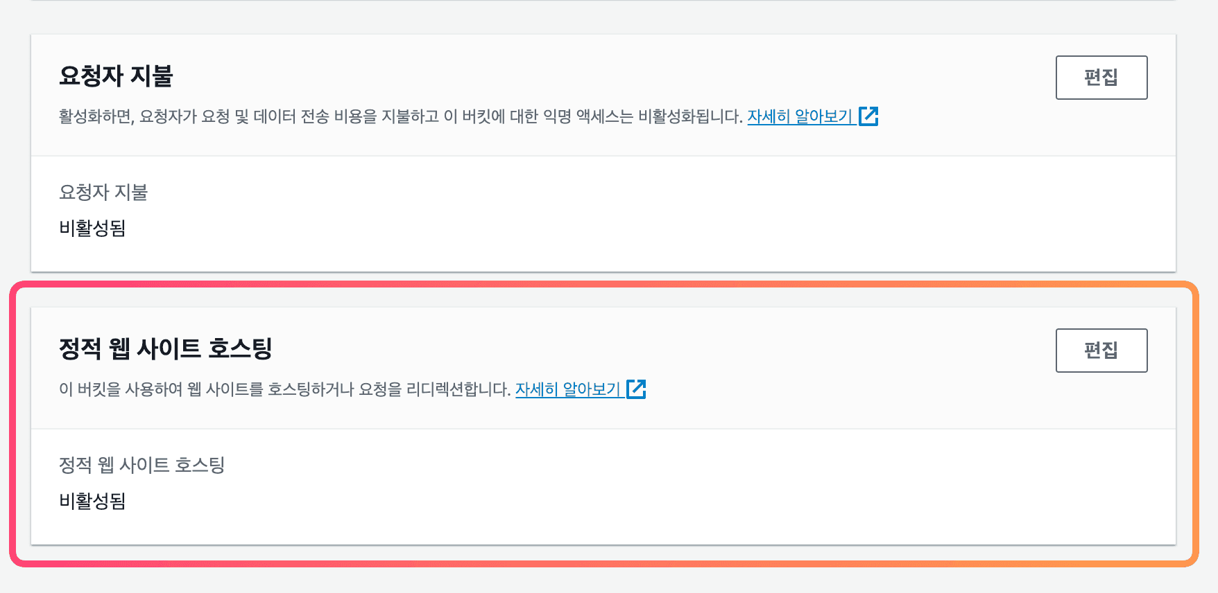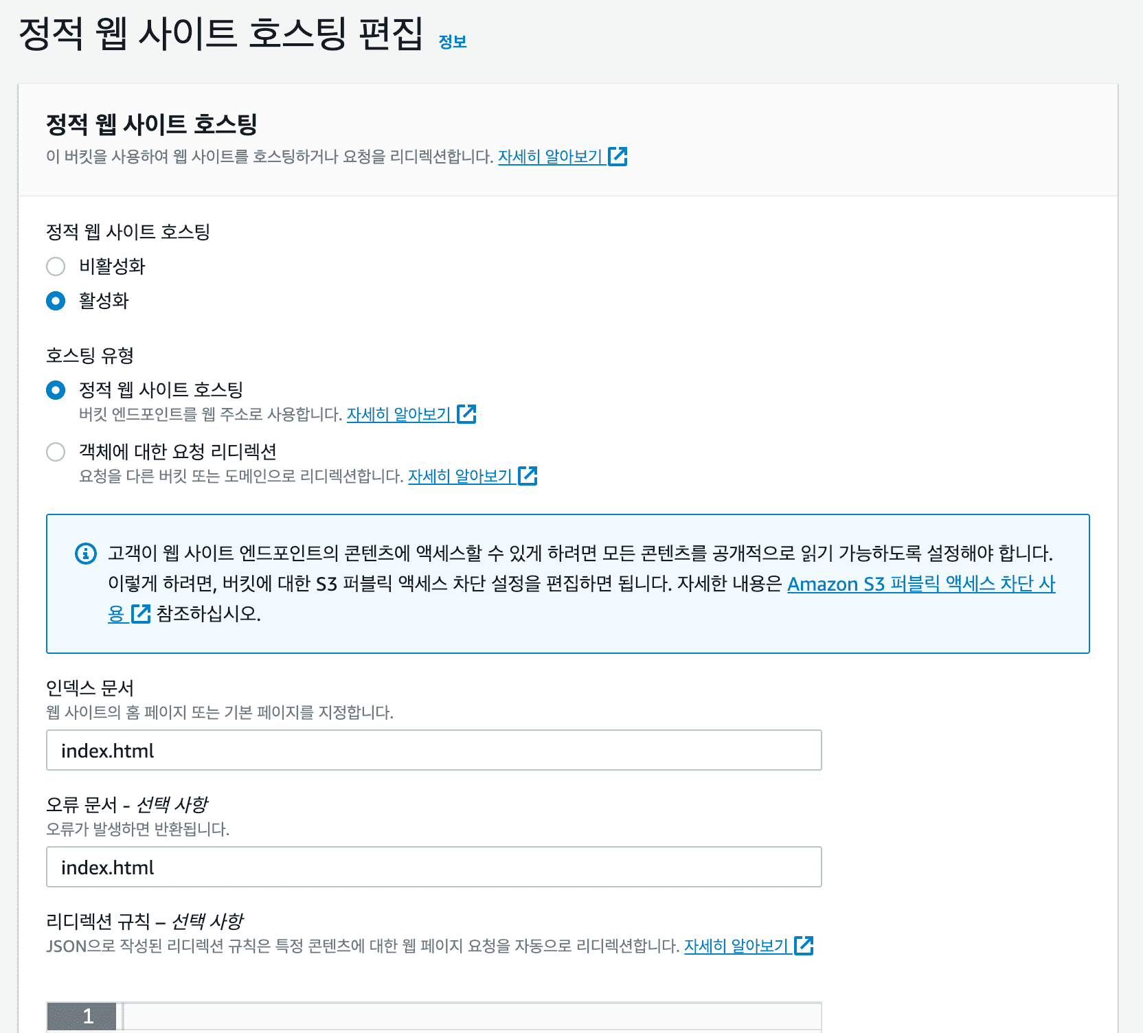 정적 웹 사이트 호스팅 옵션을 활성화로 바꿔준 후 인덱스 문서와 오류 문서의 파일명을 index.html로 변경해줍니다.