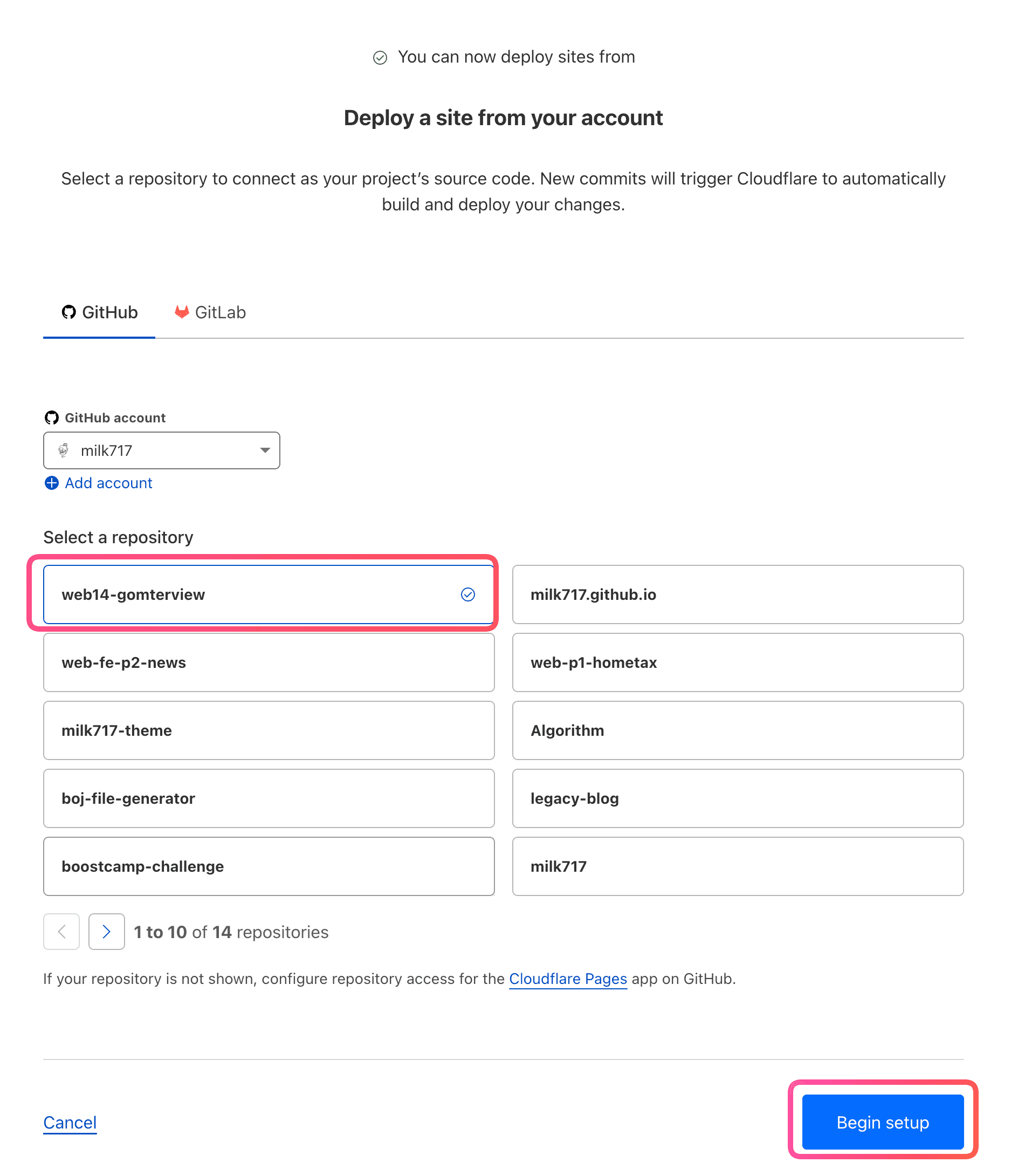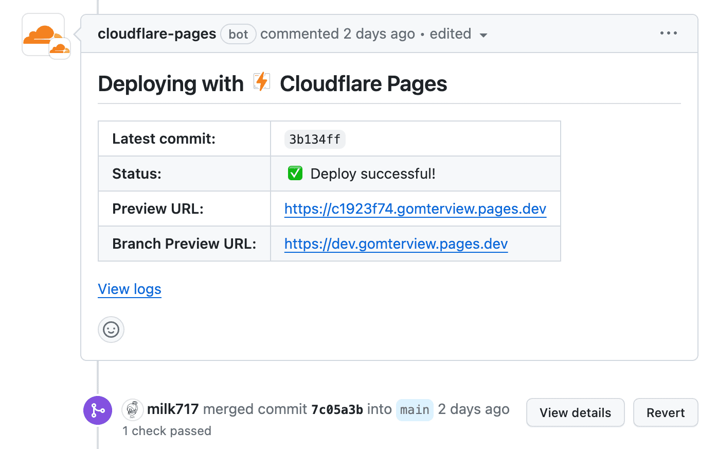 사실상 Cloudflare를 선택한 가장 주된 이유인데요. Cloudflare에서는 메인 브랜치로 PR을 보낼 때 마다 이에 해당하는 스냅샷 버전의 웹사이트를 생성해주는 기능을 제공해줍니다.