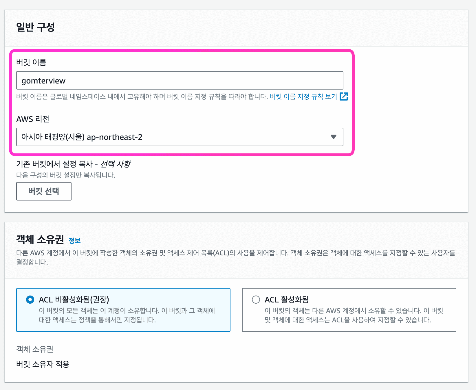 나머지 옵션은 그대로 둔채로 버킷을 생성합니다.