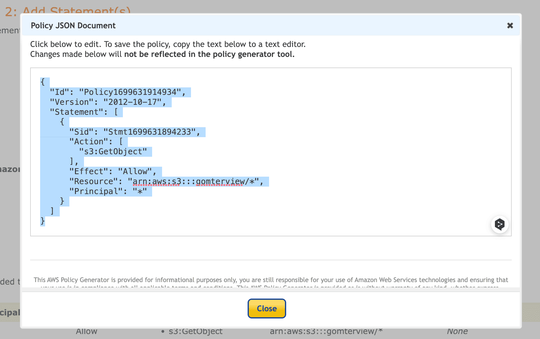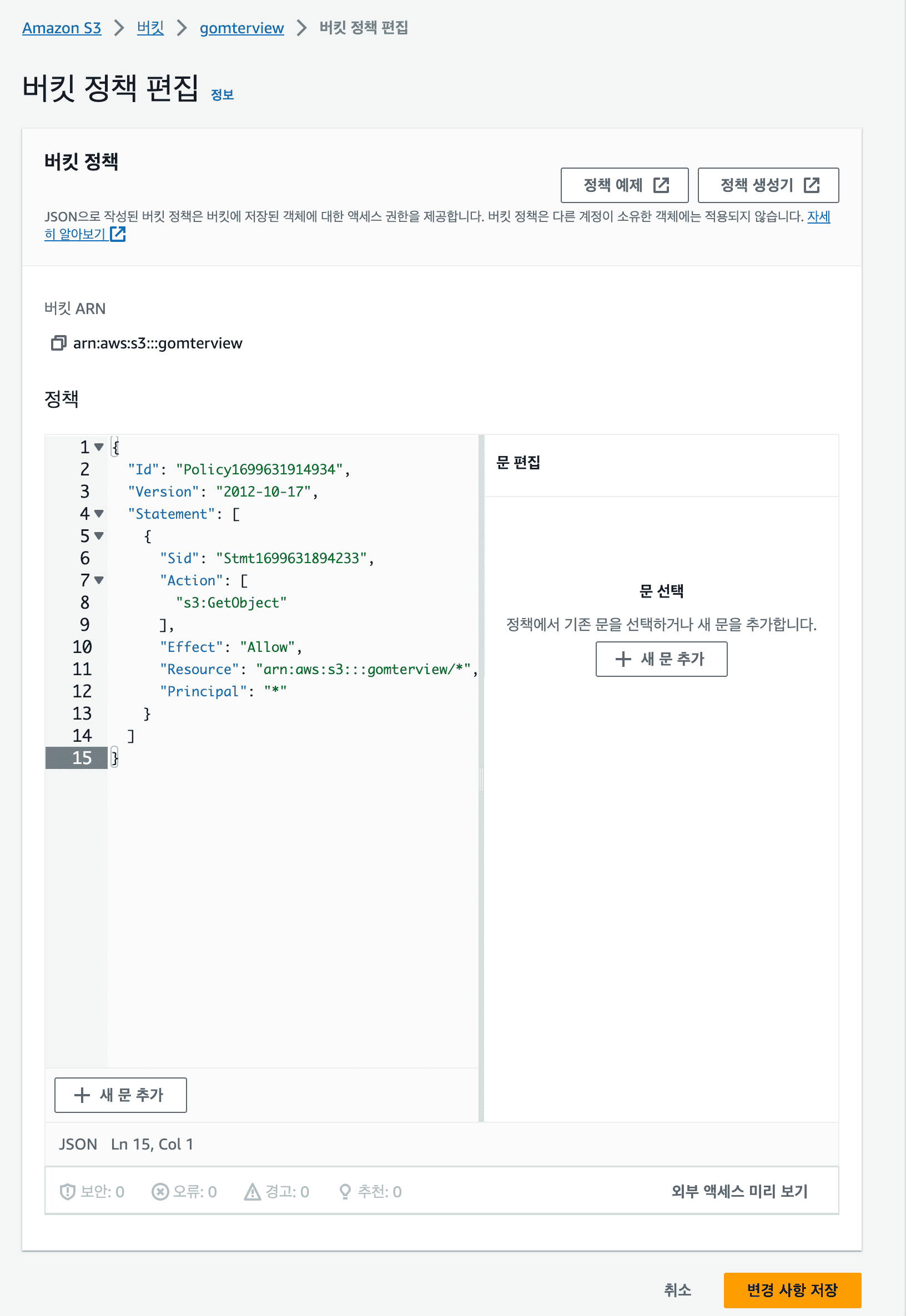 GetObject를 선택합니다. - ARN에는 아까 복사했던 버킷 ARN 뒤에