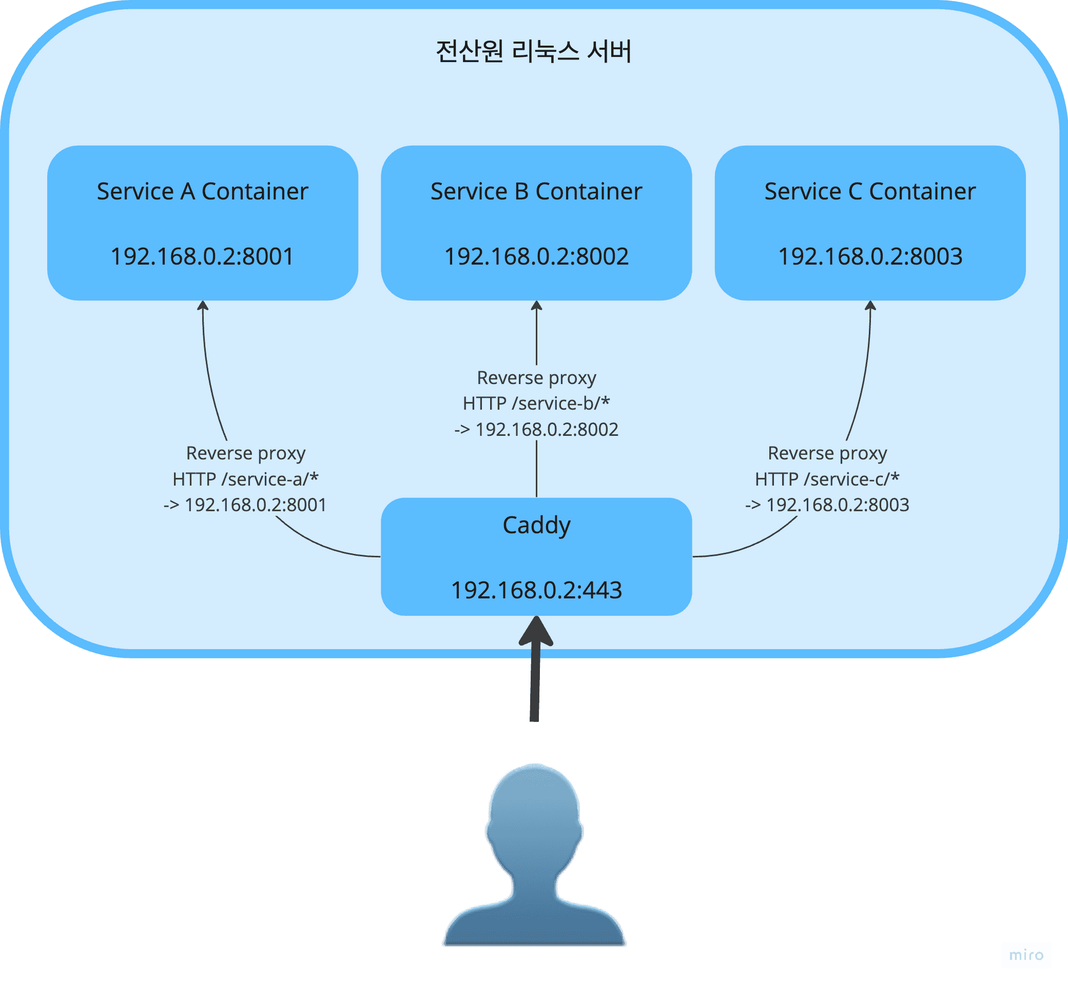 - 전산원 서버에서 돌아가는 다른 서비스들은 대부분 도커 컨테이너 위에서 돌아가고 있었습니다. 따라서 일관성을 위해 도커를 사용해야겠다고 생각했습니다. 전산원 서버는 다음과 같은 형태로 구성되어 있었습니다.