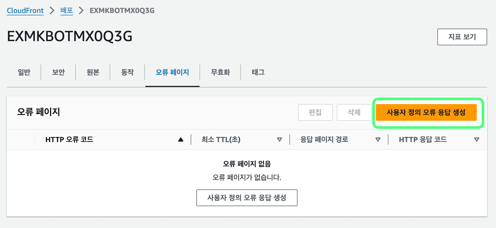 이러한 문제점은 커스텀 에러 응답을 설정해서 해결할 수 있습니다. 글 초반부에서 설명했듯이 SPA에서 라우터가 정상적으로 동작하기 위해서는 웹서버 등에서 리다이랙션하는 과정이 필요한데요. CloundFront에서 에러 페이지를 index.html로 커스텀하면 이 동작을 구현할 수 있습니다.