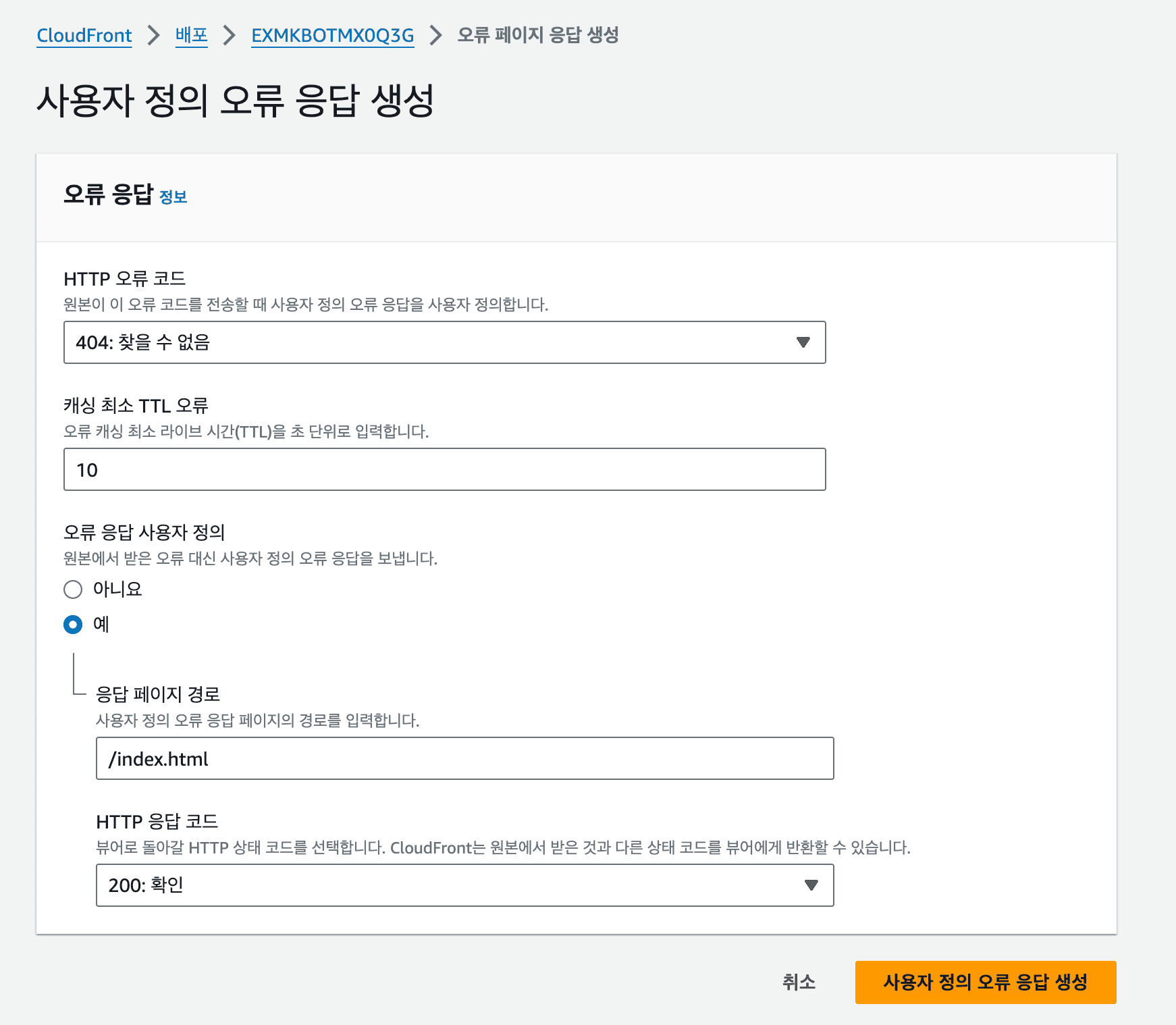 - S3는 정적 파일 호스팅이므로 리액트 라우터 처리는 Cloudfront에서 따로 처리해줍니다.