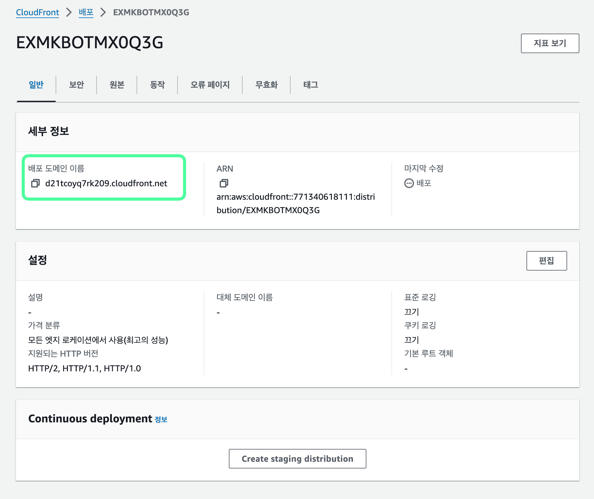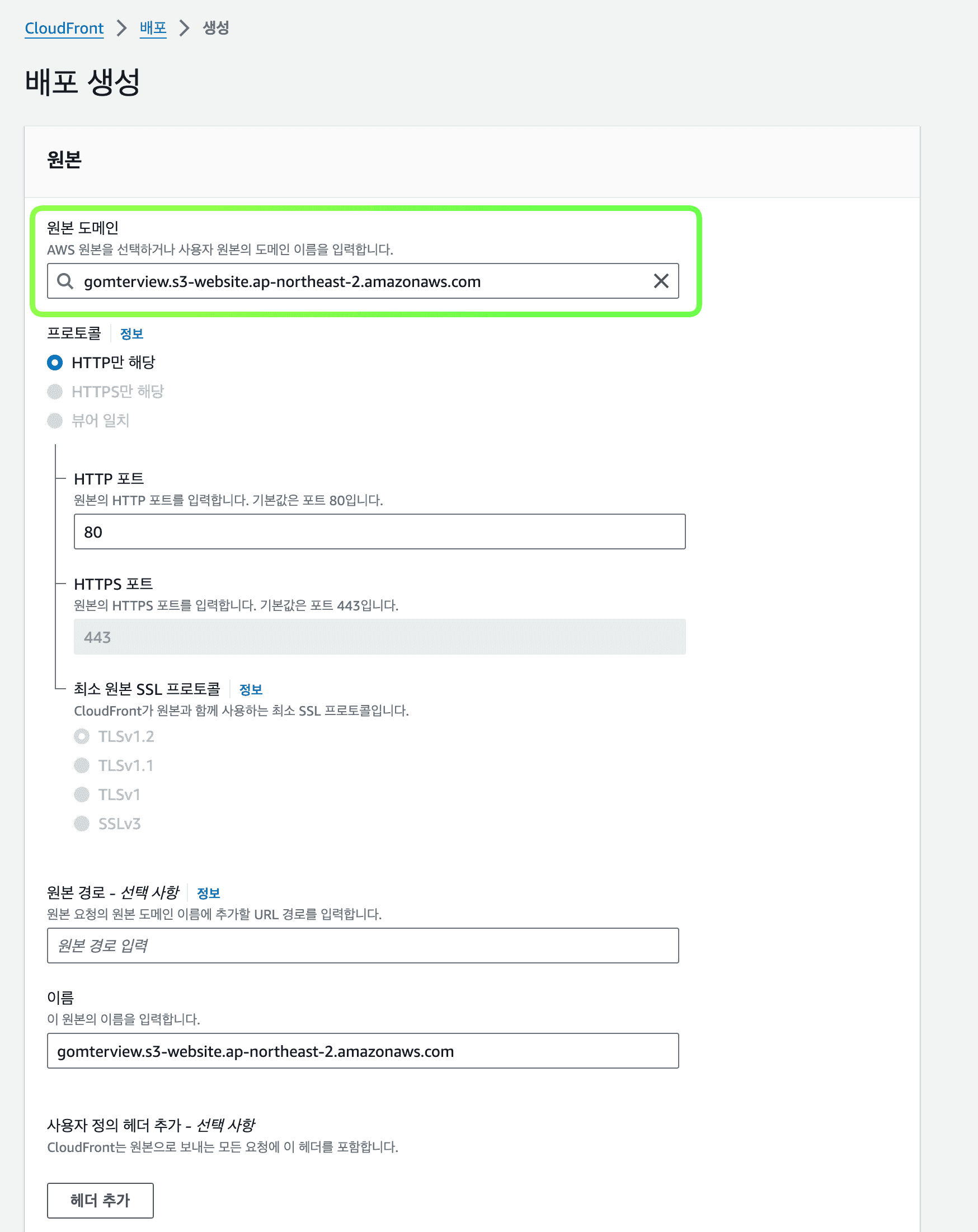 CloudFront 배포 생성하기 AWS CloudFront 서비스에 들어가서 S3로 배포된 웹사이트의 도메인을 입력합니다.