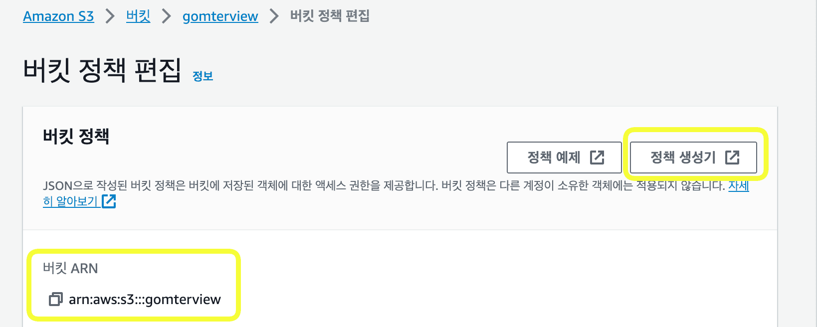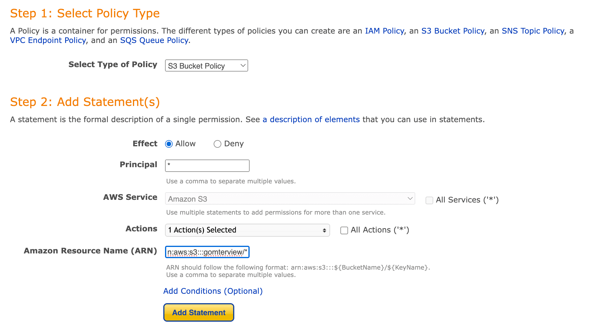 - Select Type of Policy: S3정책이므로 S3 Bucket Policy를 선택합니다.