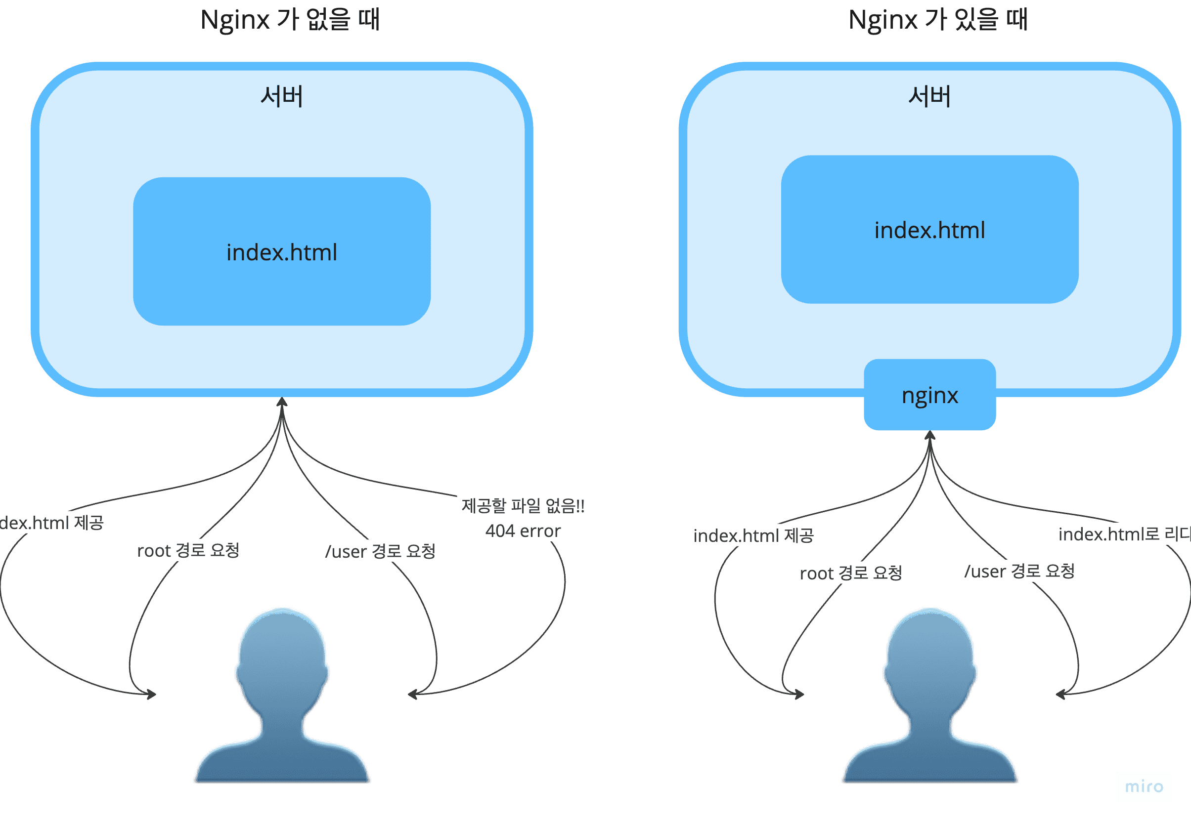 위 과정을 거치며 정적 페이지가 배포되는데요. 여기서 주의해야 할 점은 React는 SPA구조로 되어있어 사용자가 애플리케이션의 root(/) 경로에서 /user등의 경로로 이동해도 실제로는 index.html 한 파일 내에서 처리되어야 한다는 것입니다. 때문에 이에 대한 서버 설정을 별도로 하지 않으면 /user 경로로 이동시 404페이지가 반환됩니다. 따라서 Nginx등의 웹 서버와 함께 배포해서 모든 경로 요청을 index.html로 리다이랙션 하는 로직을 구현해야 합니다.