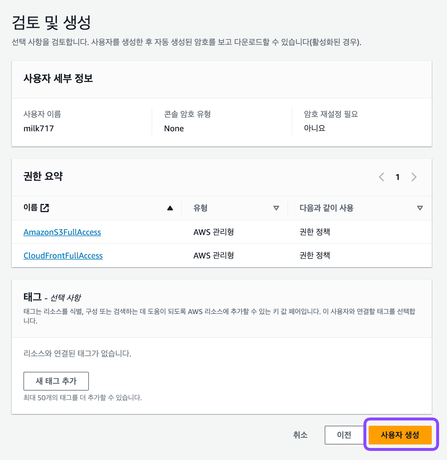 - S3 저장소에 public으로 접근할 수 있는 IAM 사용자를 생성합니다.
