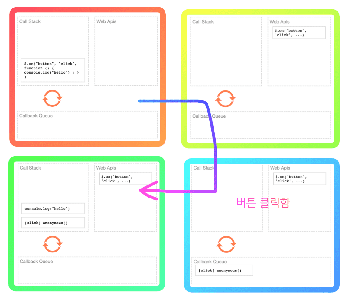 )위의 코드가 실행되면 클릭 이벤트 리스너에 console.log("hello")를 출력하는 콜백 함수가 등록됩니다. 그리고 브라우저 클릭 이벤트가 발생하면 Call Stack, Web Apis, Callback
